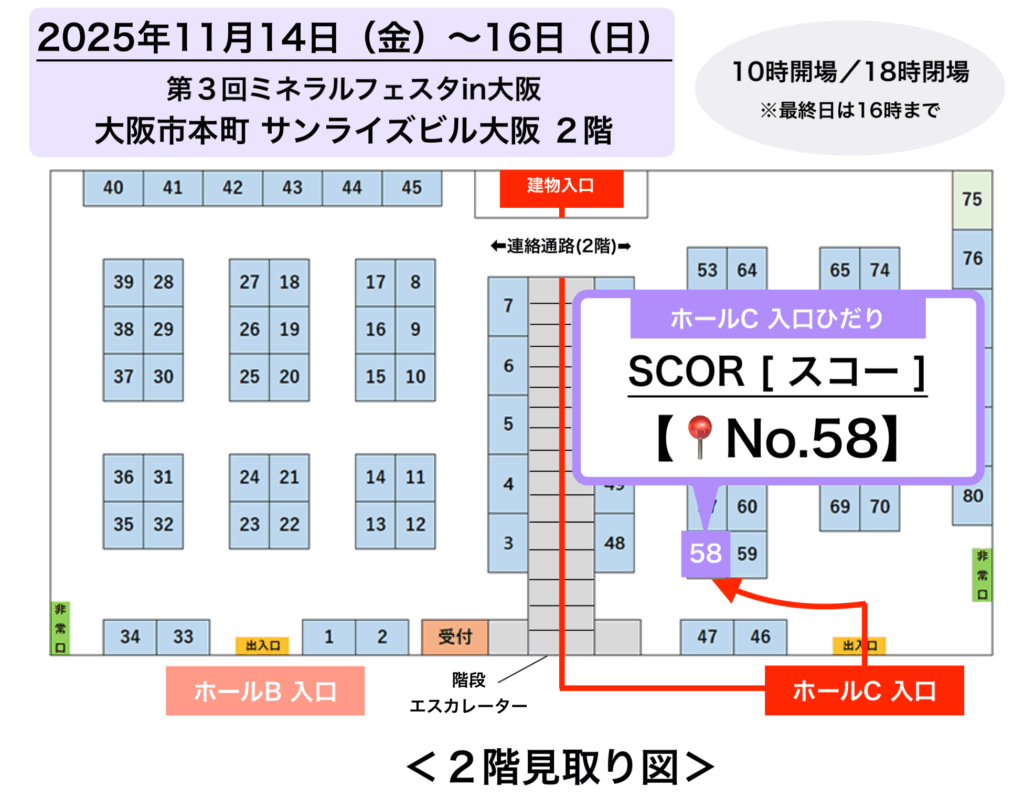 SCOR [ スコー ]のブース位置は、【ホールC 入口ひだり📍No.58】です。